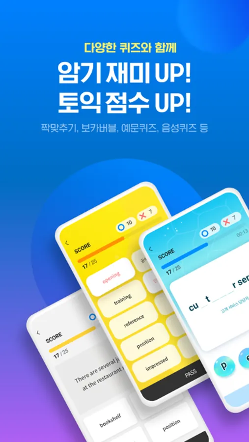 지루한 단어 암기를 재미있는 게임으로 토익 최신 기출 어휘를 쉽고 빠르게 암기할 수 있습니다.