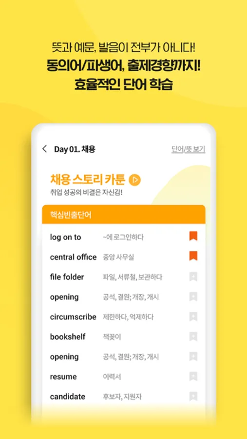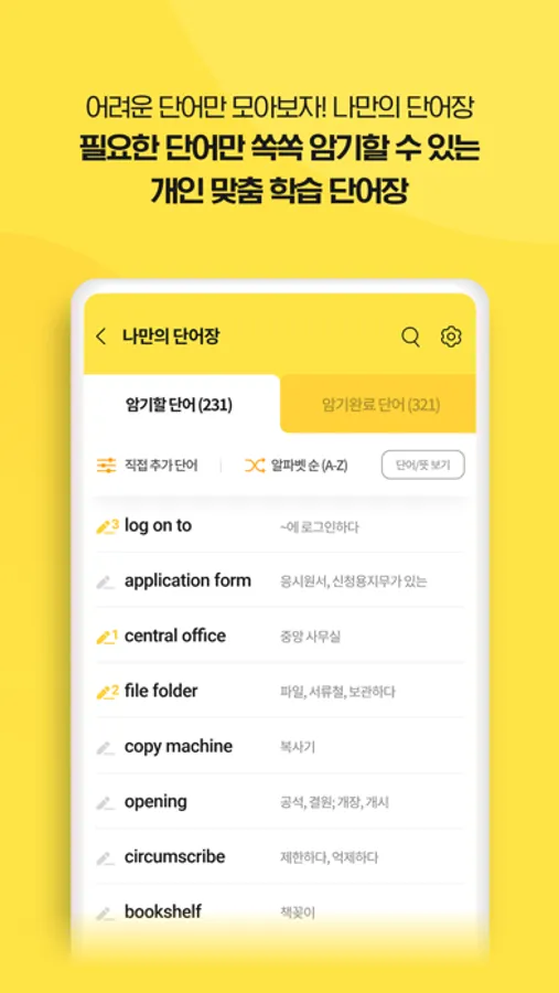 [암기할 단어]로 못 외운 단어를 한 곳에 모아 쉽게 암기하고, [암기완료 단어]로 외웠던 단어를 다시 복습할 수 있습니다.