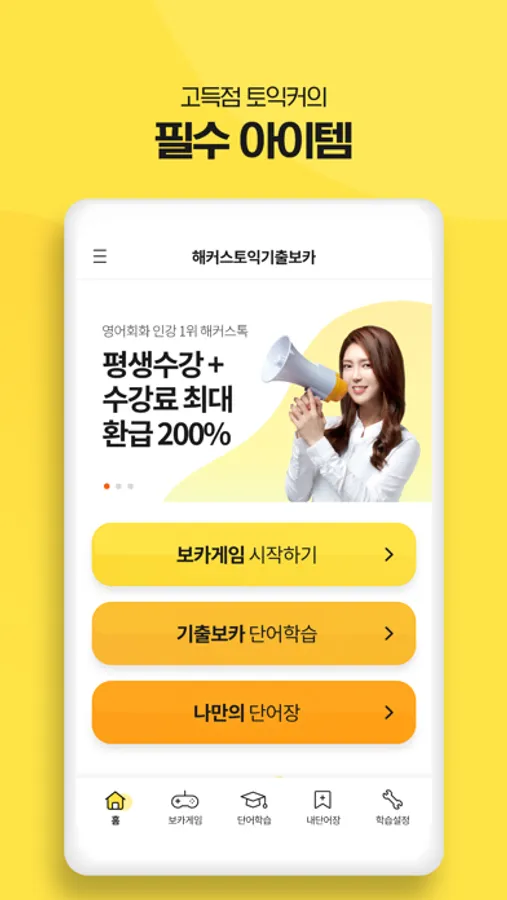 [단어카드]로 《해커스 토익 기출보카》 교재의 모든 내용학습하고, [복습게임]으로 학습한 토익 최신 기출 단어와 예문을 복습할 수 있습니다.