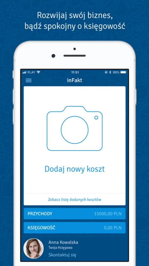 Aplikacja inFakt upraszcza przedsiębiorcom księgowość i łączy najważniejsze funkcje w jednym miejscu: wystawianie faktur, otrzymywanie przelewów za faktury, dodawanie faktur kosztowych aparatem, samodzielne prowadzenie księgowości, rozliczenia z US i opłacanie składek ZUS oraz współpracę z księgową.