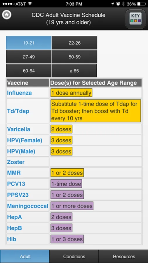 - Adult schedule, listing recommended vaccines for adults by age group and by medical conditions