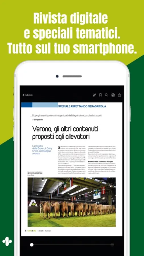 Terra e Vita - Digital Magazine è la versione digitale del settimanale dell’agricoltura: attualità, informazione ed approfondimento per l’aggiornamento degli agricoltori di oggi e la formazione di quelli di domani. Terra e Vita è da anni un punto di riferimento nel mondo agricolo, dà spazio alle analisi di mercato grazie a un filo diretto con gli operatori delle varie filiere senza perdere gli aggiornamenti sull'attualità tecnica e l’innovazione tecnologica, politica ed economica. Scaricando la App potrai: acquistare i singoli numeri, leggere l'ultimo numero in tempo reale in formato digitale, archiviare i numeri digitali nell'edicola della App, inserire i segnalibri sulle pagine di tuo interesse.