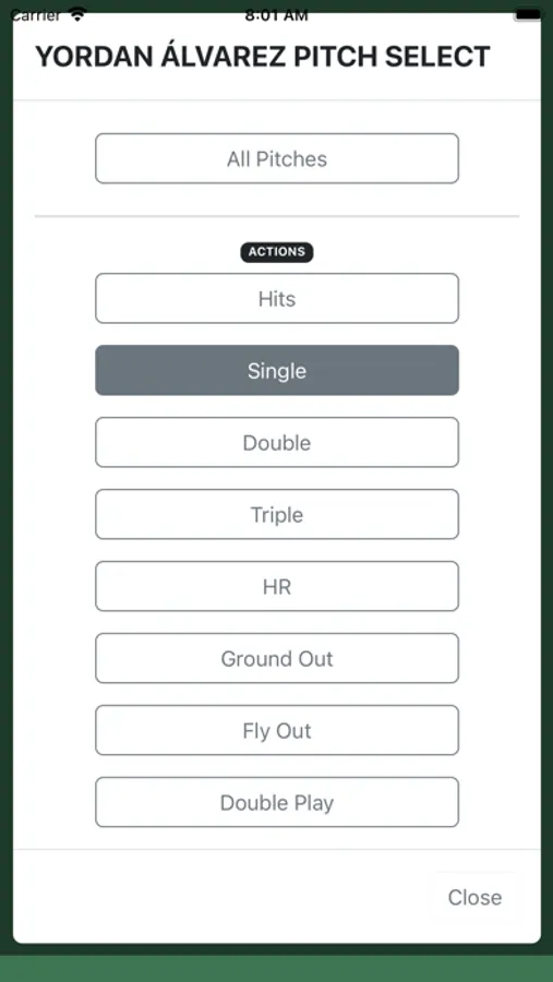 View pitch location data on MLB players based on pitch types, pitch speed, and outcome.