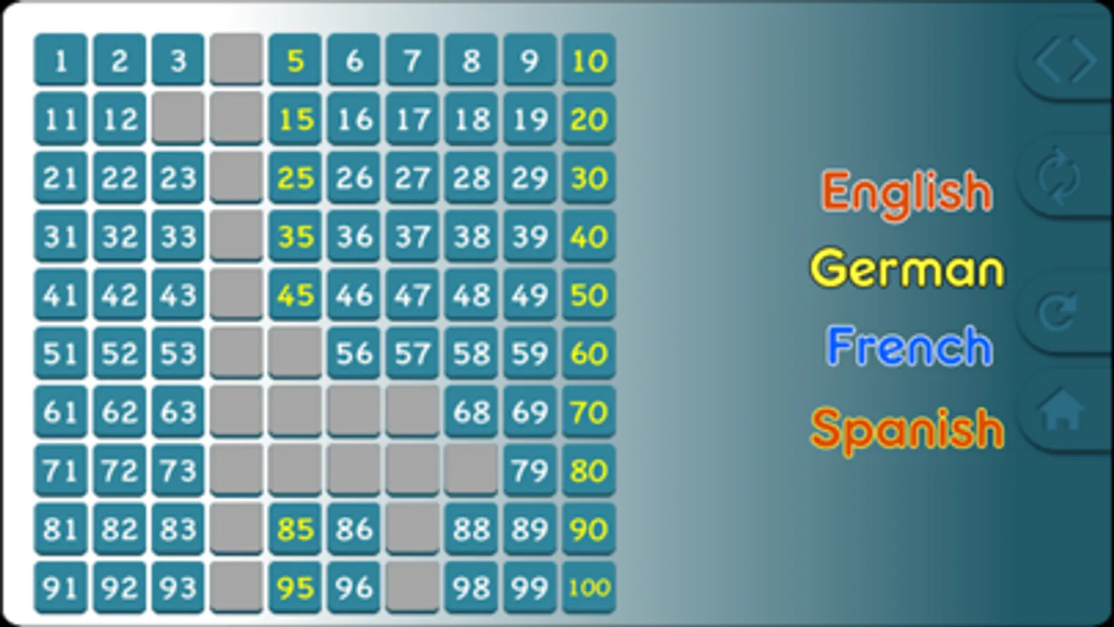 - Game find number to 10,20,30,40,50,60,70,80,90,100 in English,German,French,Spanish language: