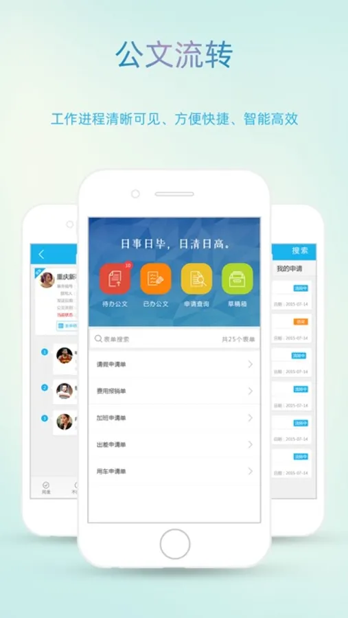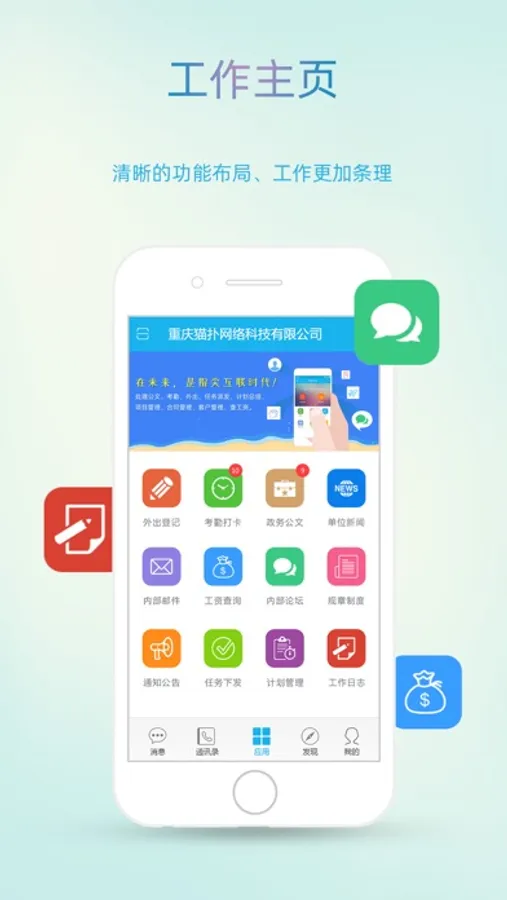 第三、交互界面清新便捷。猫扑智OA交互界面采用九宫格形式,充分展现了清新淡雅的画面、清晰的功能划分、方便的按键设置,操作起来更简单、便捷、实用。