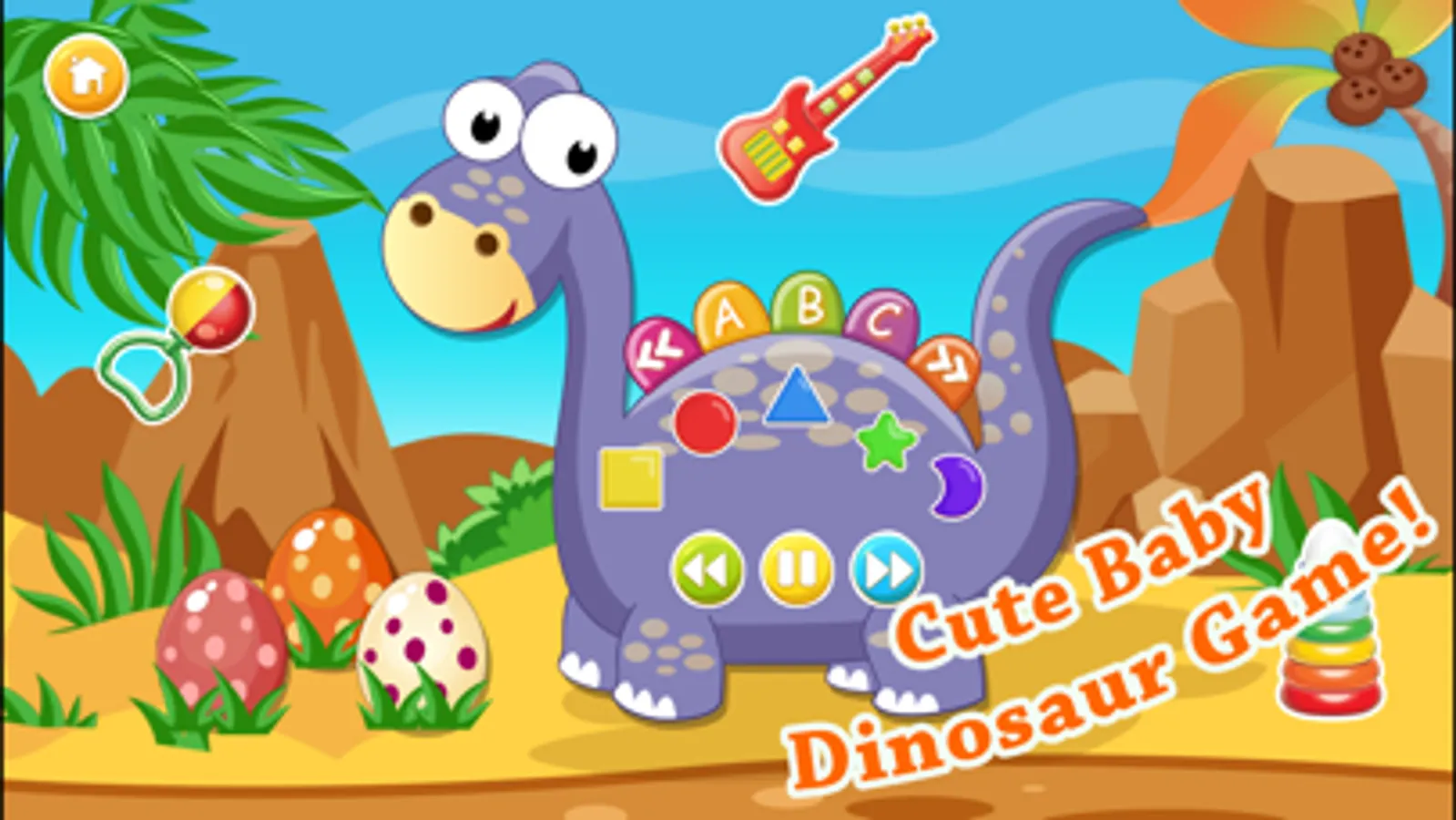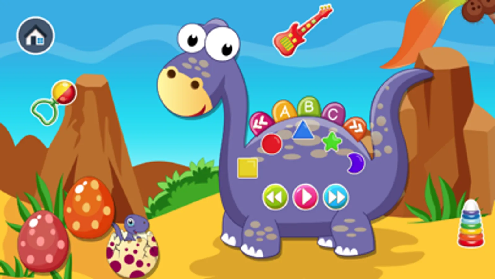 Baby Dino is a fun play game with lots of little activity for babies! In this game, kids explore shapes, colors, music and alphabets!