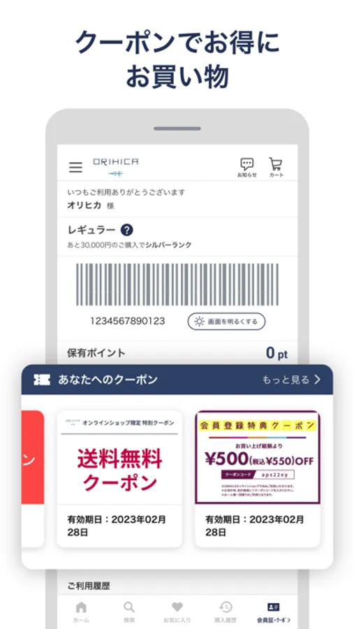 会員証としてのご利用はもちろん、購入履歴・サイズ管理機能・お気に入り情報管理など