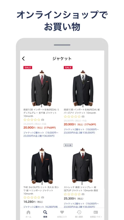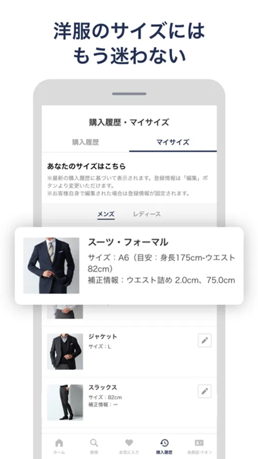 - スーツなどご購入の際も事前にサイズ情報をご確認いただけるので、スムーズにお買い物いただけます。
