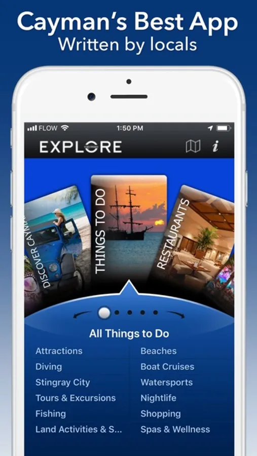 Explore 100s of things to do in the Cayman Islands; Cayman’s best restaurants with menus; detailed maps; events calendar (showing free entertainment); and lots of exclusive discounts so you can get the most out of your time in Cayman. And best of all, it's free and the app works 100% offline, so no roaming charges!