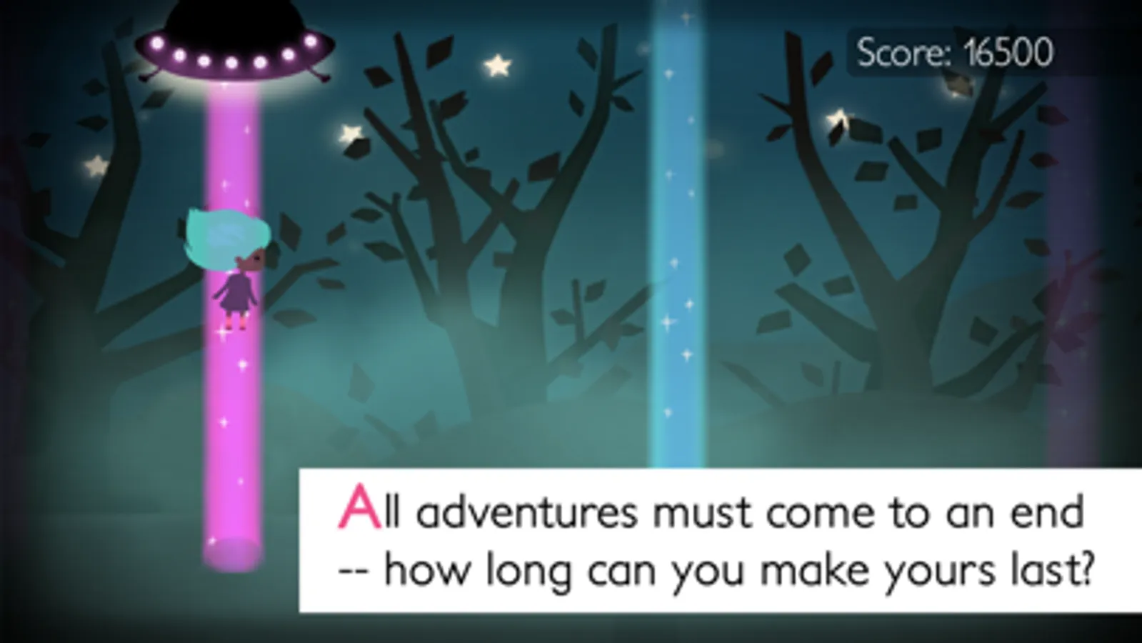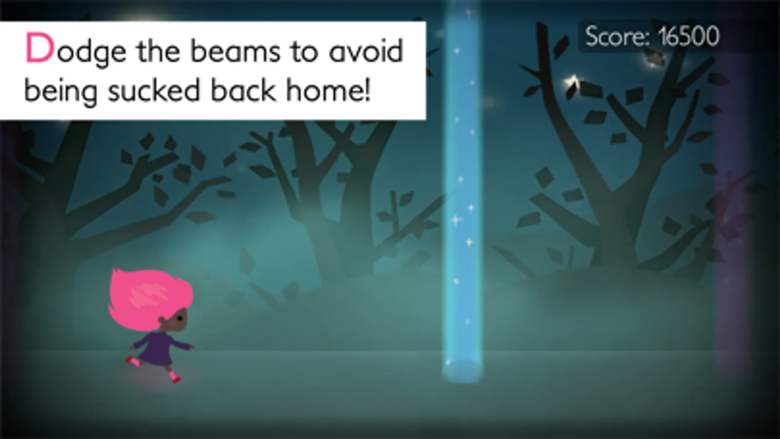 Intergalactic traveller Sally beams herself down to a mystical planet while her family sleeps. She runs free through eerie wonders and broken spaceships -- until rays of light crash down, missing her by a hair. Her parents are about to beam her back up and stop her adventure!