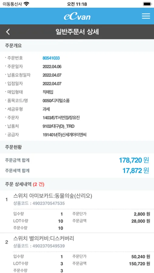 스마트폰으로 언제 어디서나 eCvan 서비스 이용이 가능한 전용 어플리케이션으로, 쉽고간편하게주문및매출등의주요내역을확인하실수있습니다