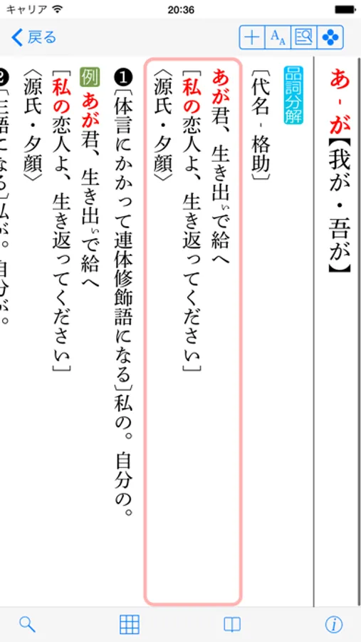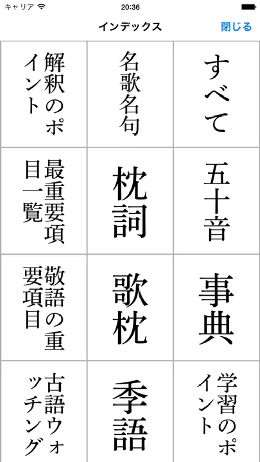 画面を最大限活用したタッチパネル検索を搭載。単語を記したパネルを所狭しと並べることで周囲の単語を見渡すこともでき、従来不足しがちとされてきた一覧性を補いました。特に本アプリでは見出し語の「五十音」順だけでなく「事典」「学習のポイント(品詞別、敬語)」「枕詞」「季語」「解釈のポイント」「図版」・・・・・といった様々なパネルが準備されており、学習のみならず楽しめる辞典となっております。