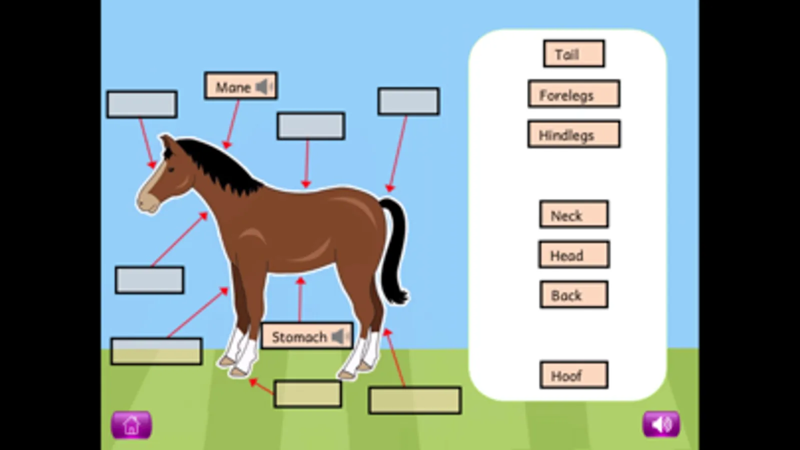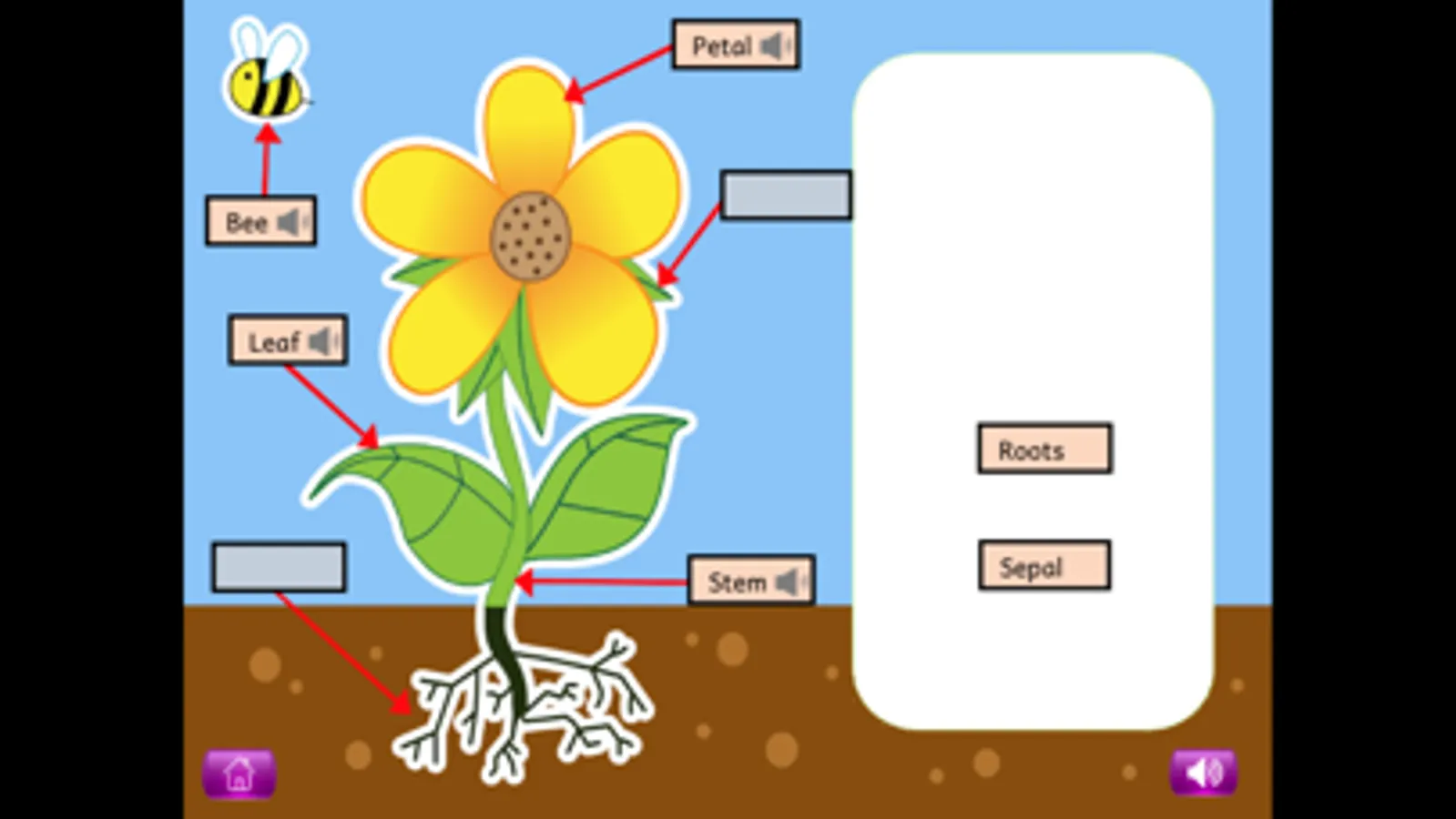 For each of these topics, a picture shown on the screen is completed by dragging the different parts (eg with a flower: petal, leaf, roots, stem etc.) from the right of the screen and placing them into the correct position. When all of the parts have been placed, labels can be added, and children can click on the labels to hear and read more about that part of the plant or living creature.