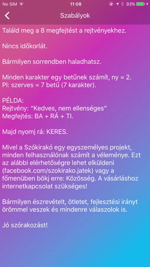 A Szókirakó 2 is egy egyszemélyes projekt, amelyben mindenkinek a véleménye számít. Így, ha bármilyen észrevételed, kérdésed vagy ötleted van, akkor várom az üzenetedet ezen az oldalon: https://www.facebook.com/szokirako.jatek. Minden megkeresésre válaszolni fogok. Szeretném tovább bővíteni a játékot és erre bármilyen ötletet szívesen veszek, úgyhogy hajrá!