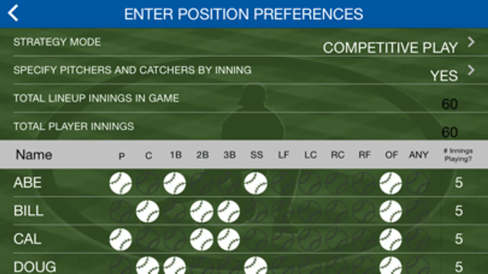 •Choose the number of innings you want each player to play and the positions you want each player to play.