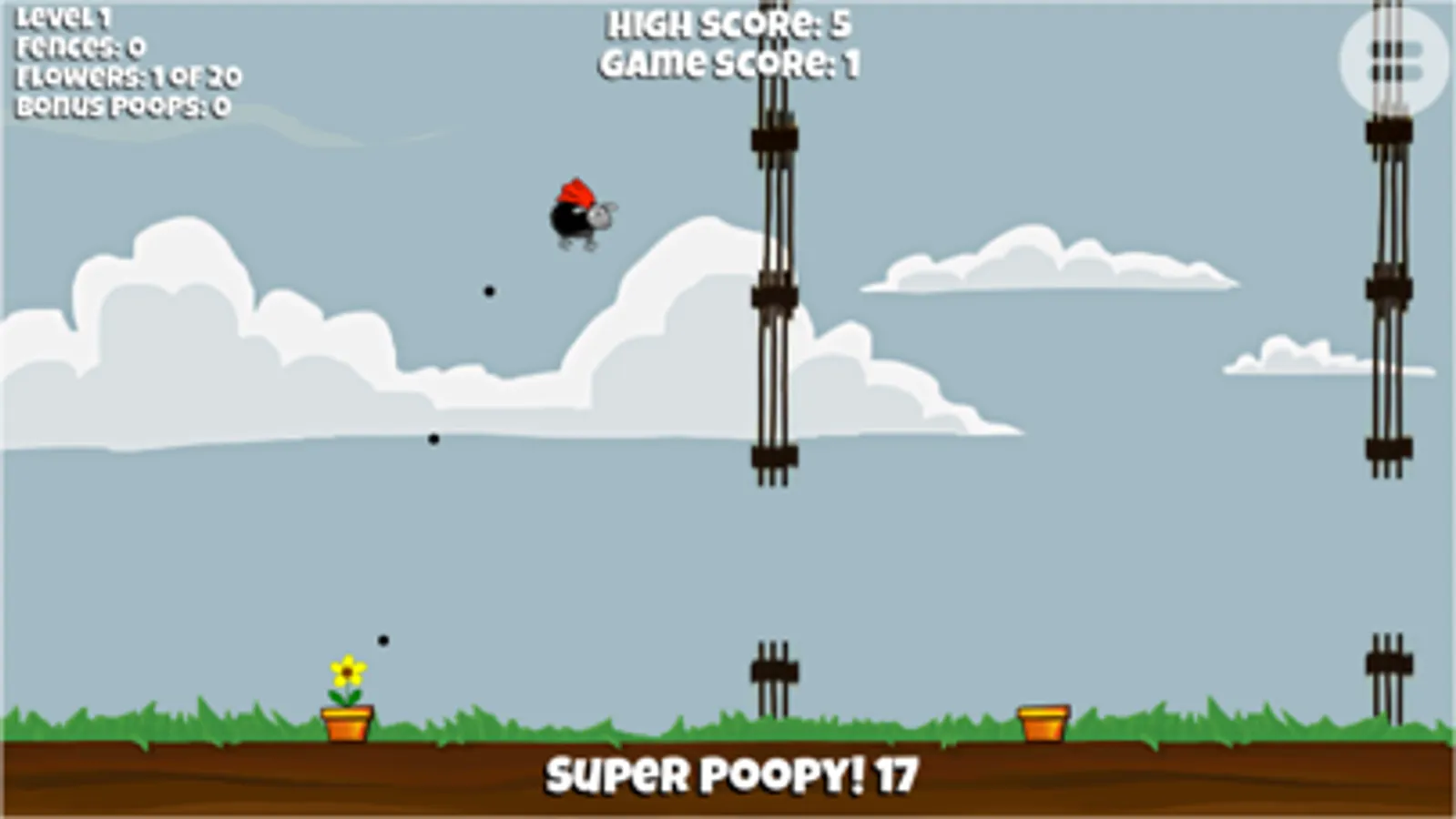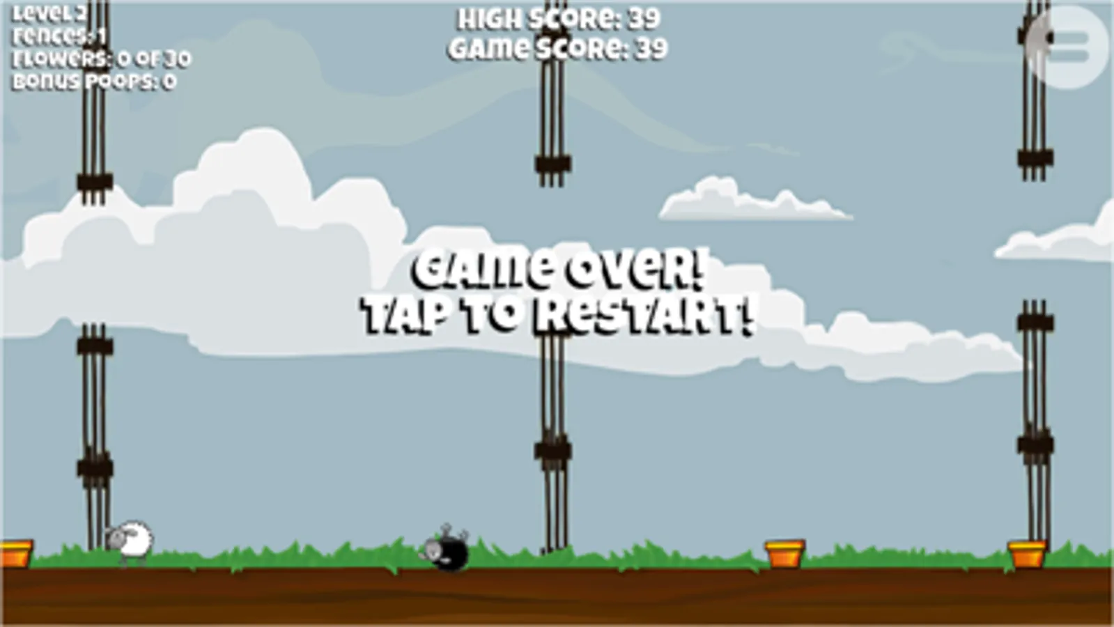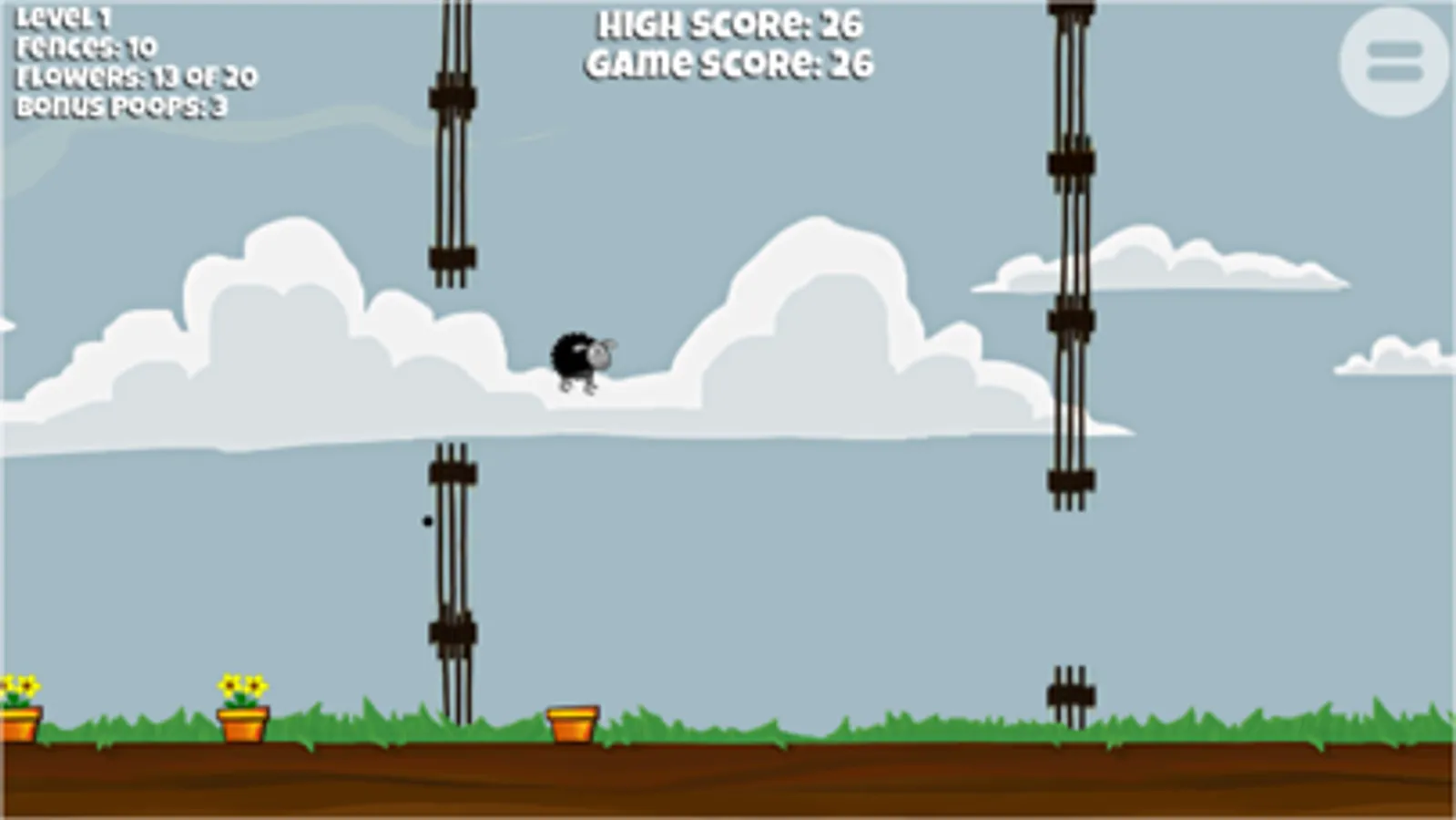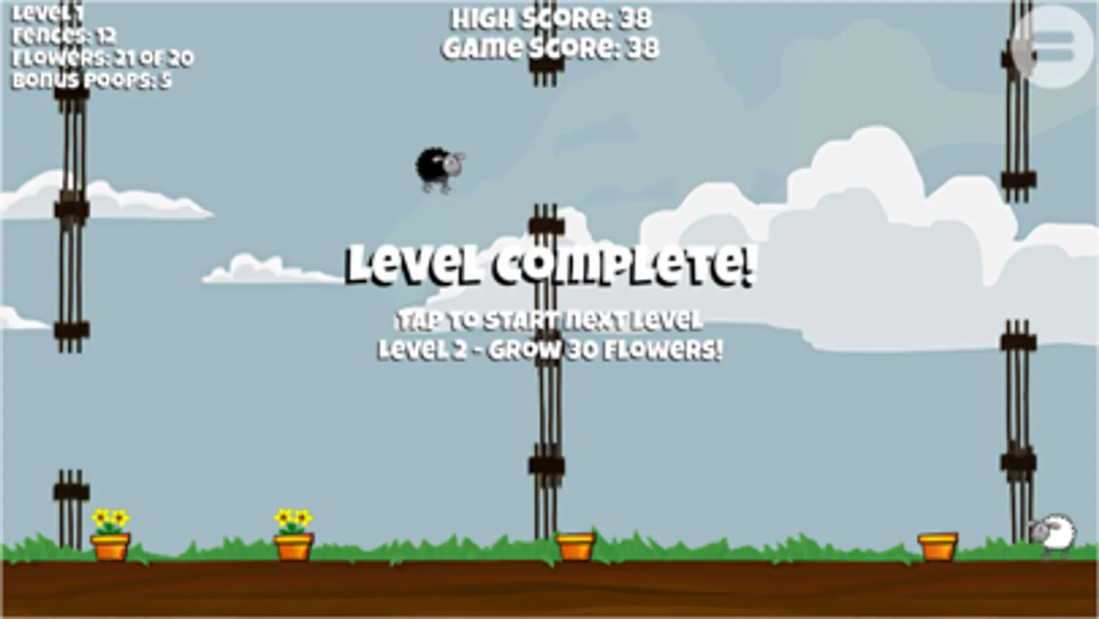 Poopy Sheep gets his magical flying ability from the power of his poop. Guide Poopy Sheep through the fences & at the same time score points (& grow flowers!) by pooping in the flower pots as he flies over them. Poop on a white sheep to enable Super Poopy mode so you can fly through fences - but don't hit the ground! The more fences you pass through & flowers you fertilize, the more points you score! Get bonus Poopy Sheep by scoring 10 bonus poops, then tapping on the Bonus Poopy activate button. Poop in the bonus pot (it only appears once per level) & get double flower & bonus scores for the rest of that level.