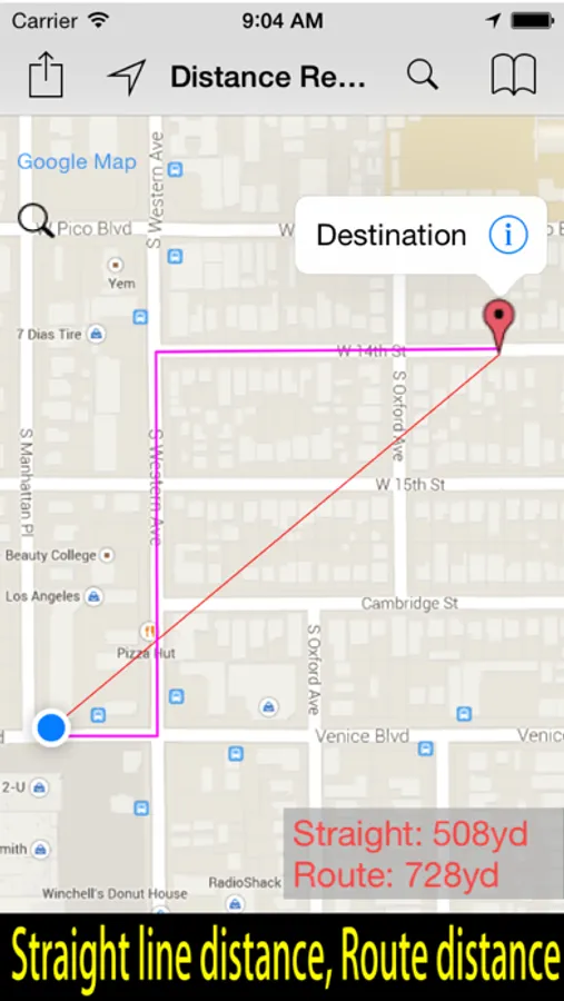 This app will display the straight-line distance, driving distance, and direction from your current location to your destination.