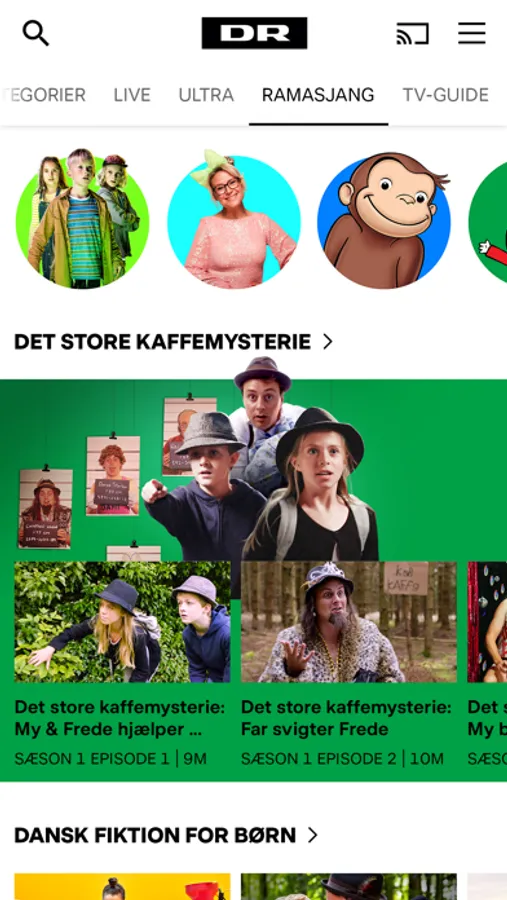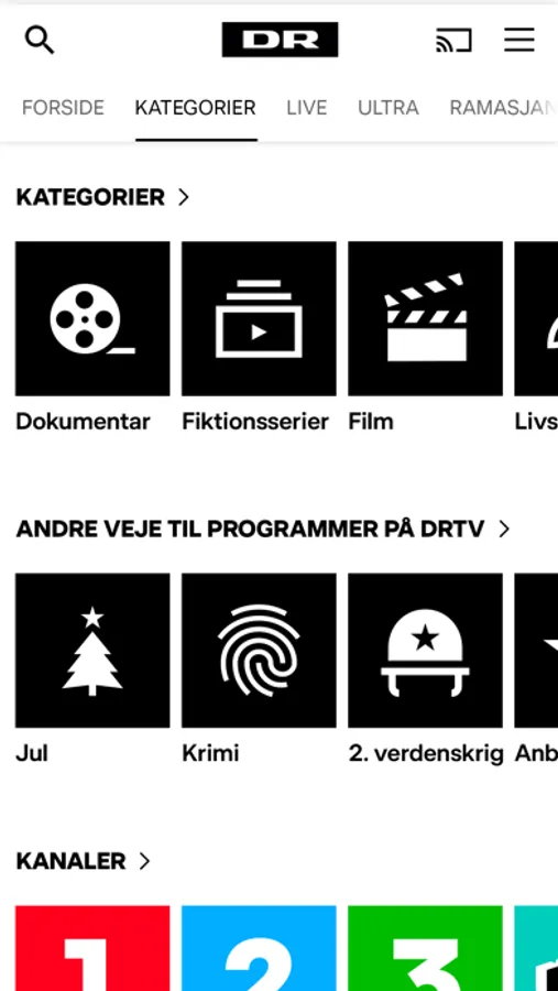 Du kan i appen se Live-TV fra DR1, DR2 og Ramasjang fra fanen ‘Live’. Du kan til en hver tid starte et program fra en af DR’s kanaler DR1, DR2, DR3, Minisjang, Ramasjang og Ultra.