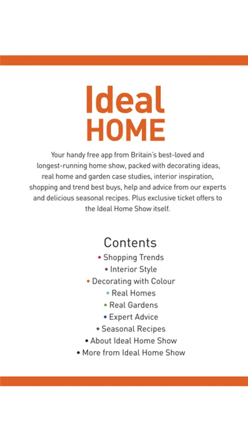 Your handy free app from the Ideal Home Show, Britain’s best-loved and longest-running home show, filled with decorating ideas, home case studies, garden case studies, interior inspiration, shopping and trend best buys, help and advice from our Ideal Home Show experts and delicious seasonal recipes. Plus exclusive ticket offers to the Ideal Home Show itself.