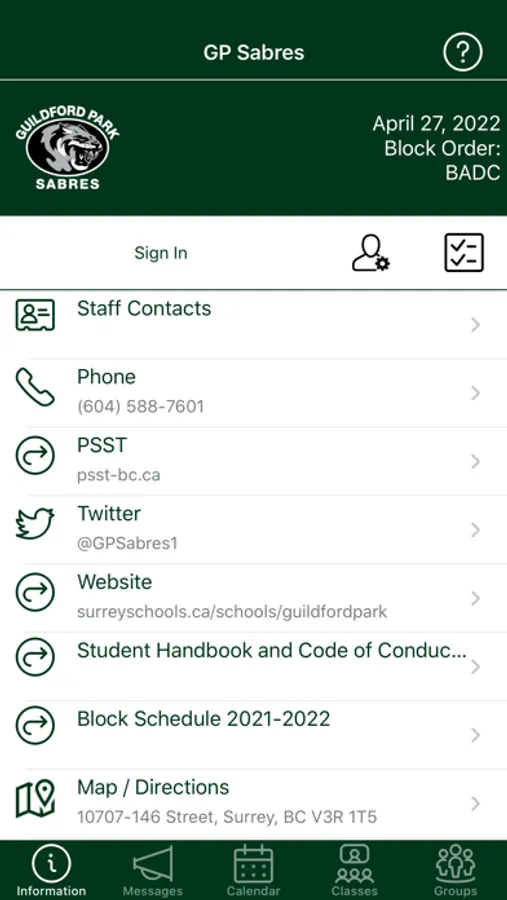 * Conveniently e-mail, phone, or navigate to the school, or reach the website or social media.