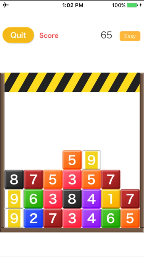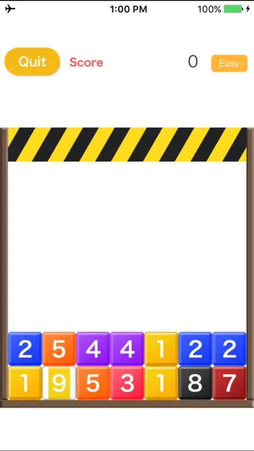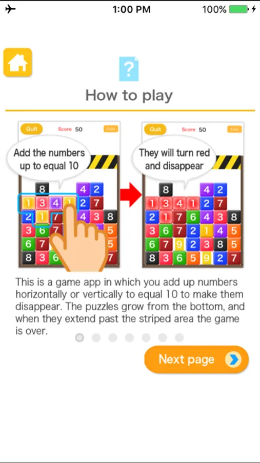 This is a game app in which you add up numbers horizontally or vertically to equal 10 to make them disappear. The puzzles grow from the bottom, and when they extend past the striped area the game is over.