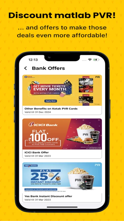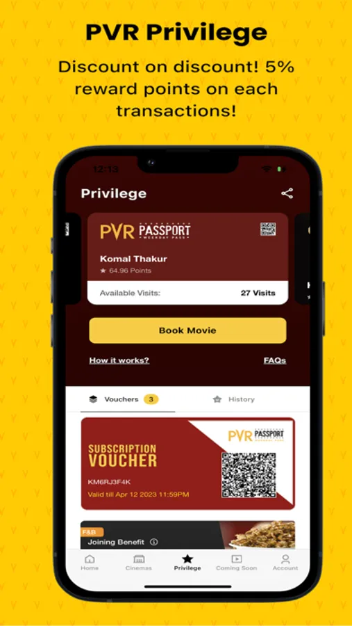 • PVR Privilege –. Get set to be rewarded on every transaction you make at PVR Cinemas or on our website. You earn 5 PVR Privilege Points for every INR 100 you spend on tickets & food & beverage items. Free Large Popcorn (Salted) on your first transaction post enrolment. The goodness doesn't end here; after earning 50 points, you automatically receive a voucher for the amount. Your vouchers are valid on subsequent transactions at our cinemas, as well as on our website and mobile app. That's not all! With PVR Privilege membership, you get birthday bonuses, invite to exclusive events & premieres and more, to make your movie-going experience hugely rewarding.