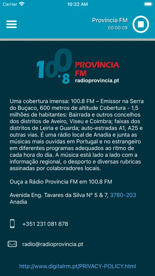 Uma cobertura imensa: 100.8 FM – Emissor na Serra do Buçaco, 600 metros de altitude Cobertura - 1,5 milhões de habitantes: Bairrada e outros concelhos dos distritos de Aveiro, Viseu e Coimbra; faixas dos distritos de Leiria e Guarda; auto-estradas A1, A25 e outras vias. É uma rádio local de Anadia e junta as músicas mais ouvidas em Portugal e no estrangeiro em diferentes programas adequados ao ritmo de cada hora do dia. A música está lado a lado com a informação regional, o desporto e diversas rubricas assinadas por colaboradores locais.