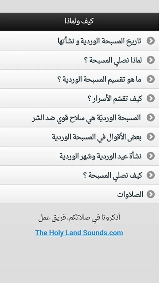 This Rosary app is very special, it is made by “The Holy Land Sounds” team from the Holy Land, Nazareth the home town of our Lord Jesus, Mary and Joseph. It is made in Arabic - the language of the Christians of the Holy Land. You can meditate with us asking our Mother Mary to lead you to Her Son Jesus . This prayer is coming to you from Marys home in Nazareth, the Holy Grotto of Annunciation, where the Angel told Her: “Hail Mary full of grace the Lord is with Thee…”
