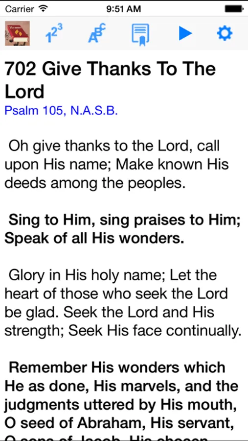 The user interface has a clean look with no ads, and very easy to use. You can quickly and easily find the hymn that you want either by selecting from the alphabetical index of hymn titles and first lines, the numerical index of hymn numbers based on the Seventh-day Adventist Hymnal®, or your own bookmark list. There is a full featured bookmark list for you to add songs that you need for quick access. Use the search feature to quickly search for words in the title or first line, or just enter a hymn number to jump directly to that hymn. You can also swipe left or right to go to the next or previous song just like turning pages in the printed hymnal. But what is even better is that the swipe turning sequence can either be in numerical hymn number order, alphabetical hymn title order, or bookmark list order. Zoom in for larger texts both in portrait or landscape orientations.