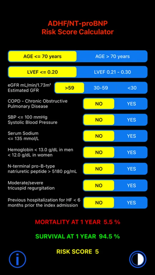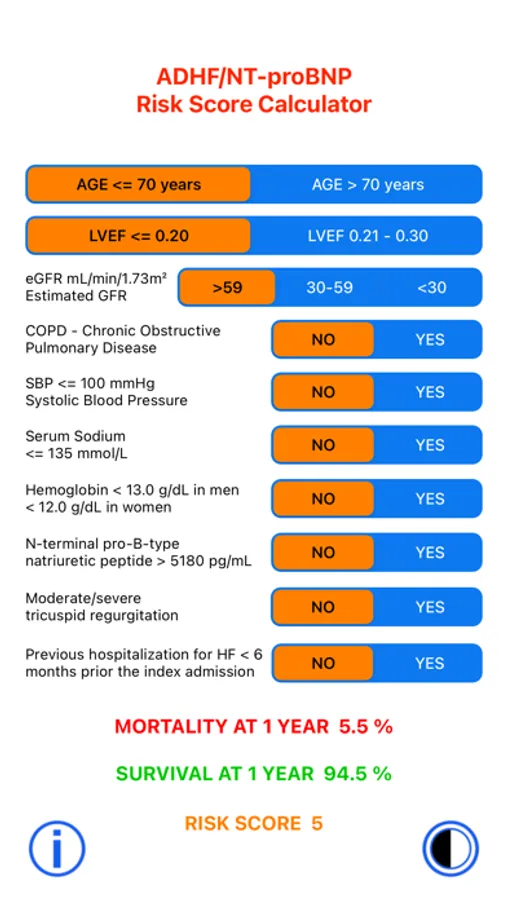 The ADHF/NT-proBNP Risk Score Calculator is a medical quick and easy to use calculator to determine the ADHF/NT-proBNP score.