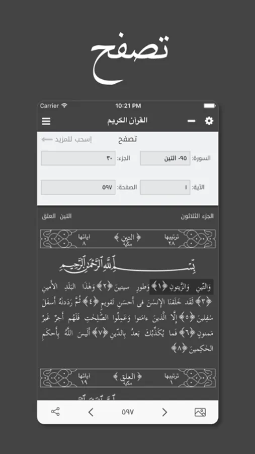 - إمكانية التنقل بين السور والآيات والأجزاء والصفحات بسرعة وسهولة.