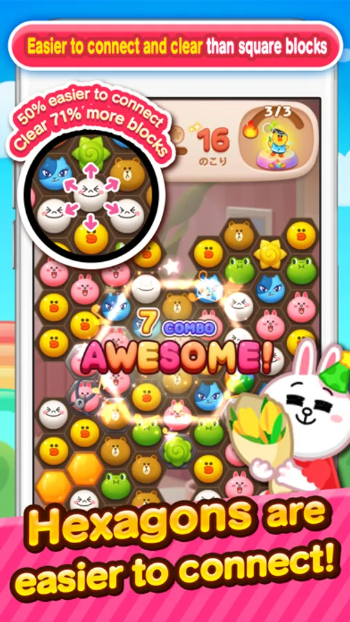 Move blocks in 6 different directions to line up 3 of a kind and clear them from the board. Complete missions and clear levels. Connect with your LINE account to exchange gifts and compete in the rankings.