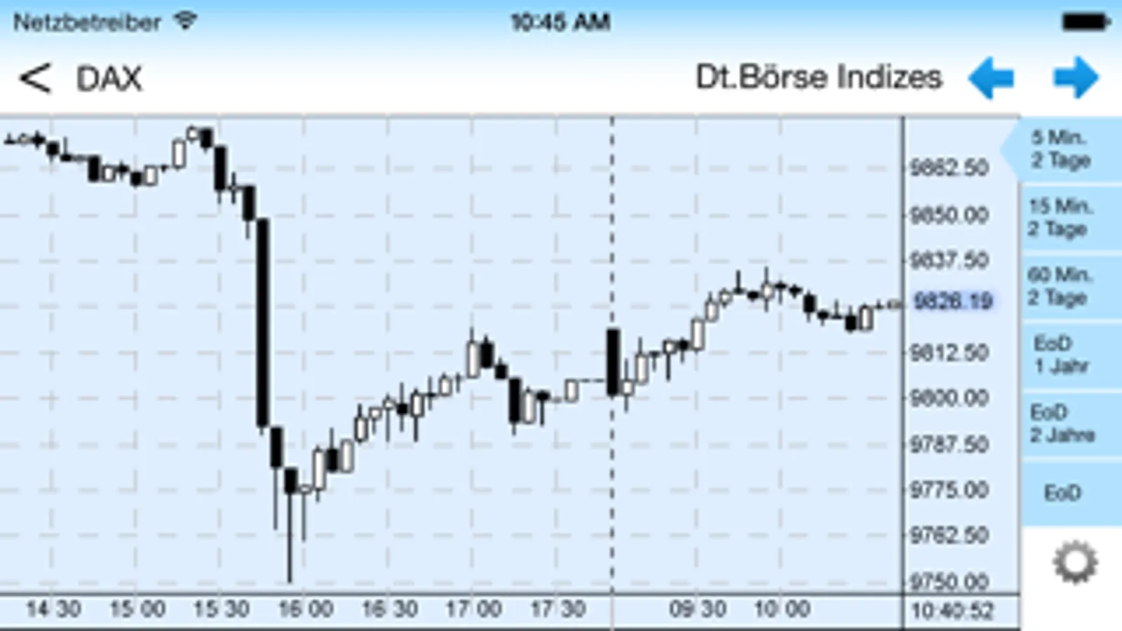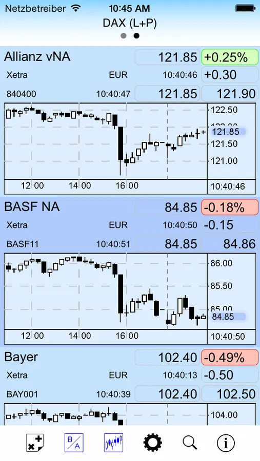 Tai-Pan Realtime Mobile bietet Ihnen Charts mit Zeitrastern von 1-Minutencharts bis hin zu Langfristcharts auf Tagesbasis. Zur schnellen Übersicht können auch in Watchlisten Charts eingeblendet werden. Für die technische Analyse stehen Ihnen neben einer umfangreichen Auswahl von Gleitenden Durchschnitten natürlich auch die am häufigsten eingesetzten technischen Indikatoren zur Verfügung.
