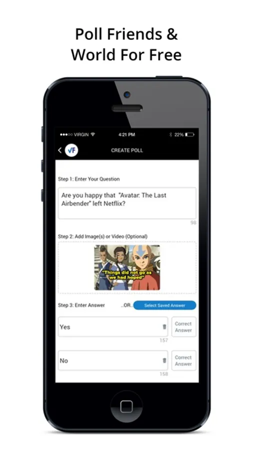 Vote Frenzy is free. There are no restrictions on the number of polls you create or the number of answers you can receive. Use the app to create polls, and register at our website to create enhanced mobile ads, polls, coupons and games to grow your business.