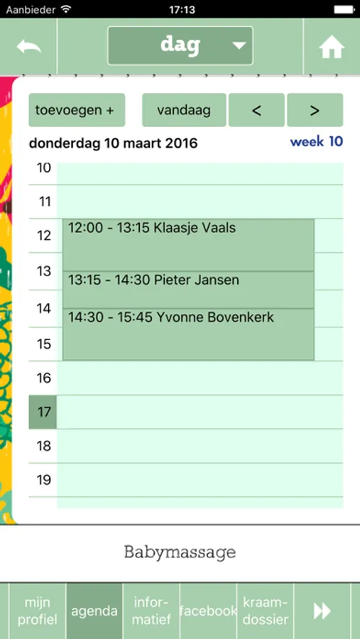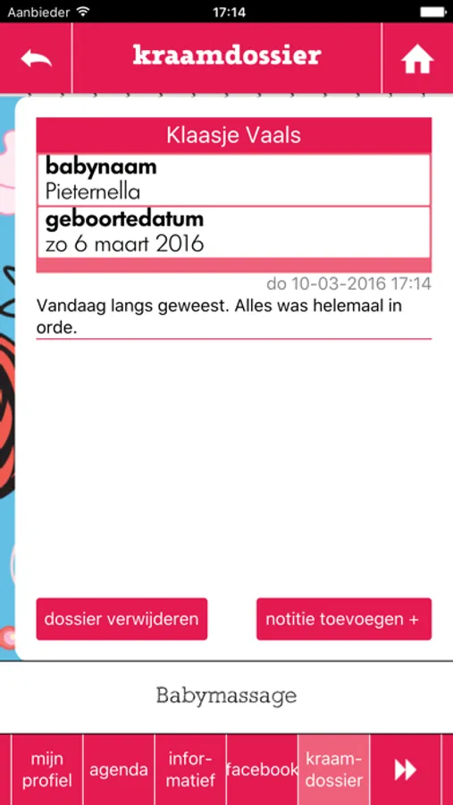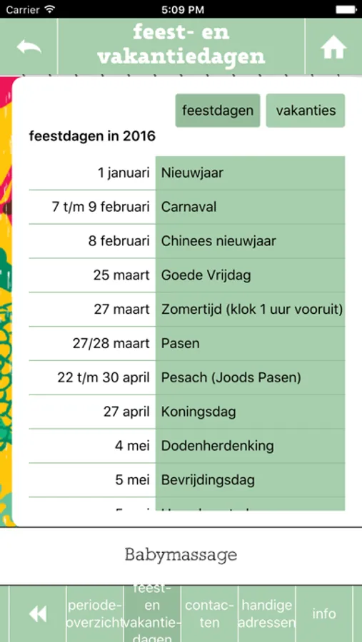 Daarnaast biedt deze app op een overzichtelijke manier veel informatie, zoals vele nuttige adressen, handige tips, een overzicht van feest- en vakantiedagen in 2015 en Facebook-berichten van Vakblad Kraamzorg.