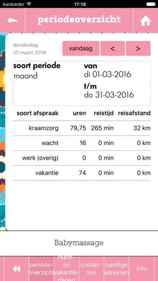 Deze app bevat een digitale versie van de agenda, periodeoverzichten van gewerkte uren, reistijden en kilometers en een kraamdossier.