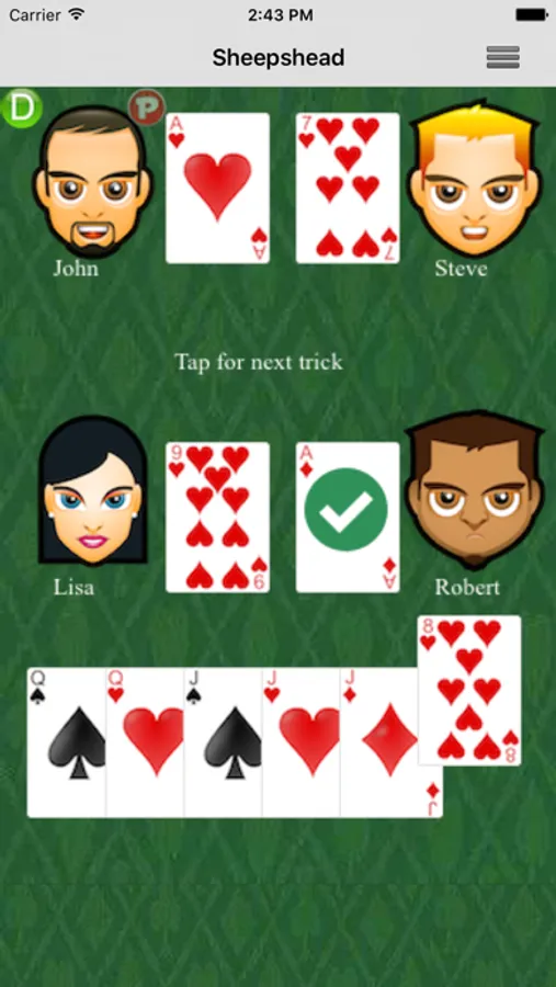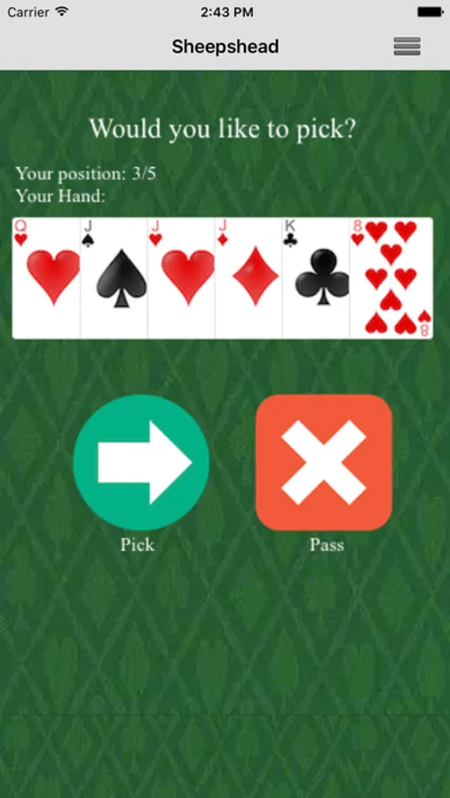 Play Sheepshead at any time. Sheepshead is a trick-taking card game. This is a single player version with computer controlled opponents.