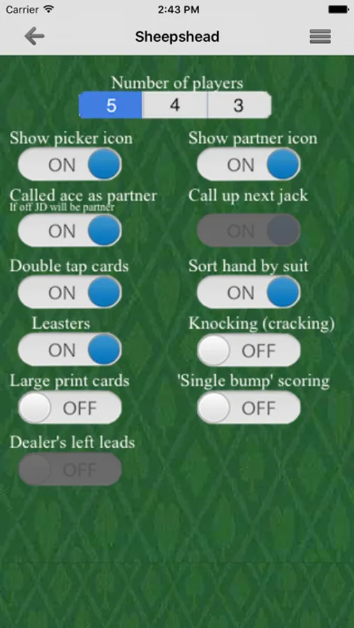 *Leasters: Enable in options menu. If leaster is not enabled and picking is passed by all players, the dealer will pick.