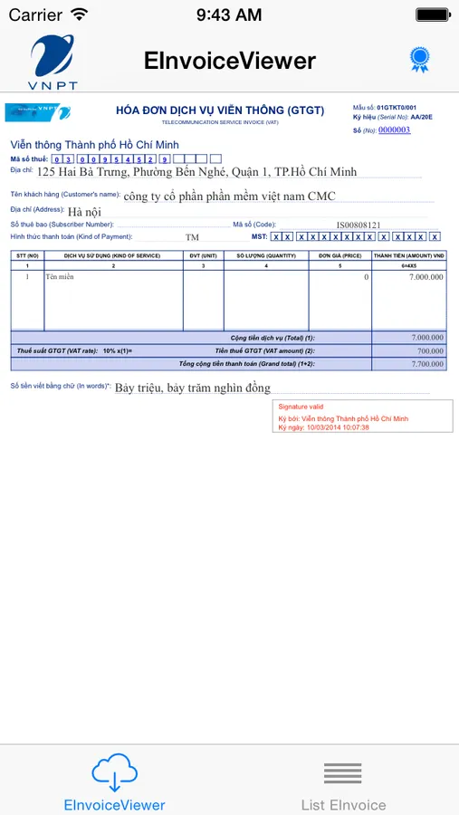 Thông tin về dịch vụ E-INVOICE: http://hoadondientu-vnpt.vn