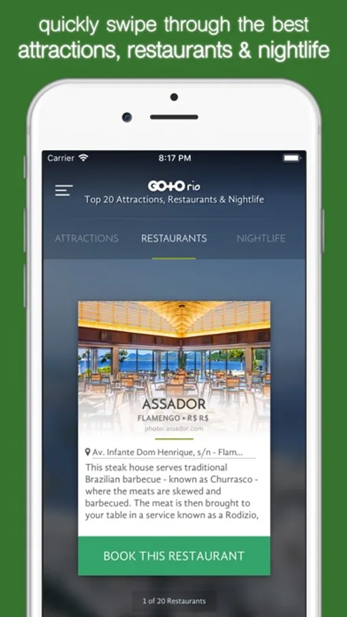Explore Brazil's lively City of Rio de Janeiro with the "Go To Rio" travel guide. Our tourist guide, photos, top things to do, top restaurants and nightlife are available offline!