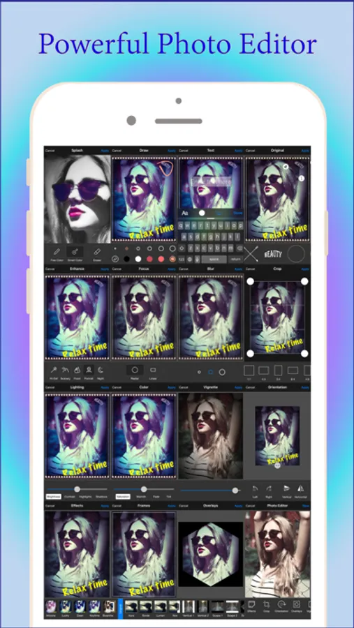 Features include: Effects, Crop, Orientation, Overlays, Vignette, Frames, Stickers, Blur, Focus, Enhance, Color, Lighting, Text, Meme, Splash, Sharpness, Draw, Whiten, Blemish, Redeye.