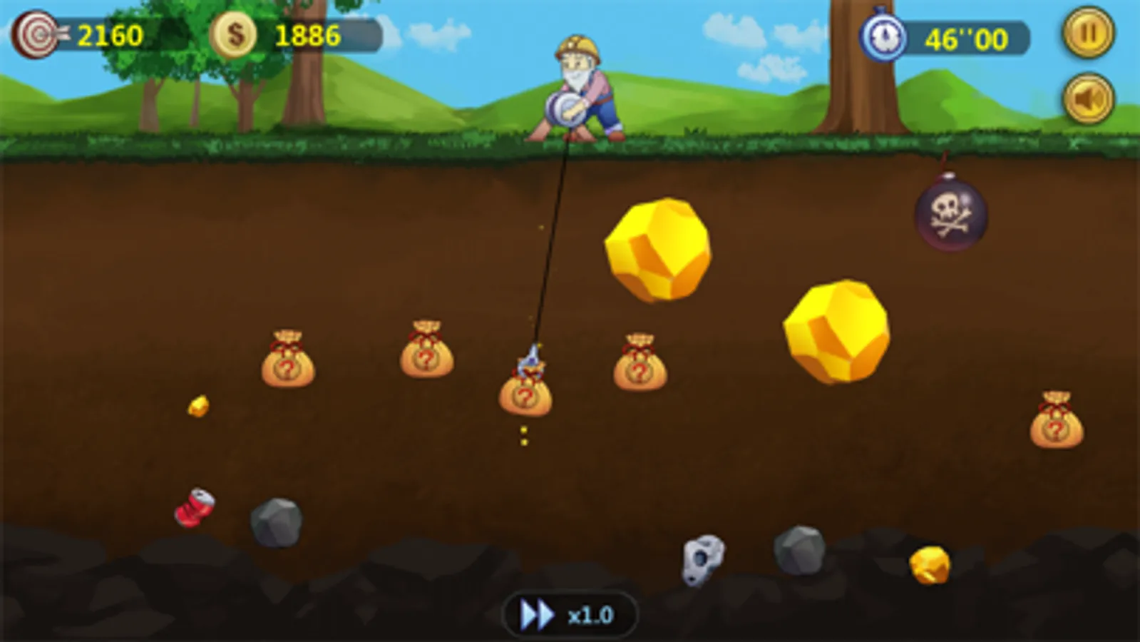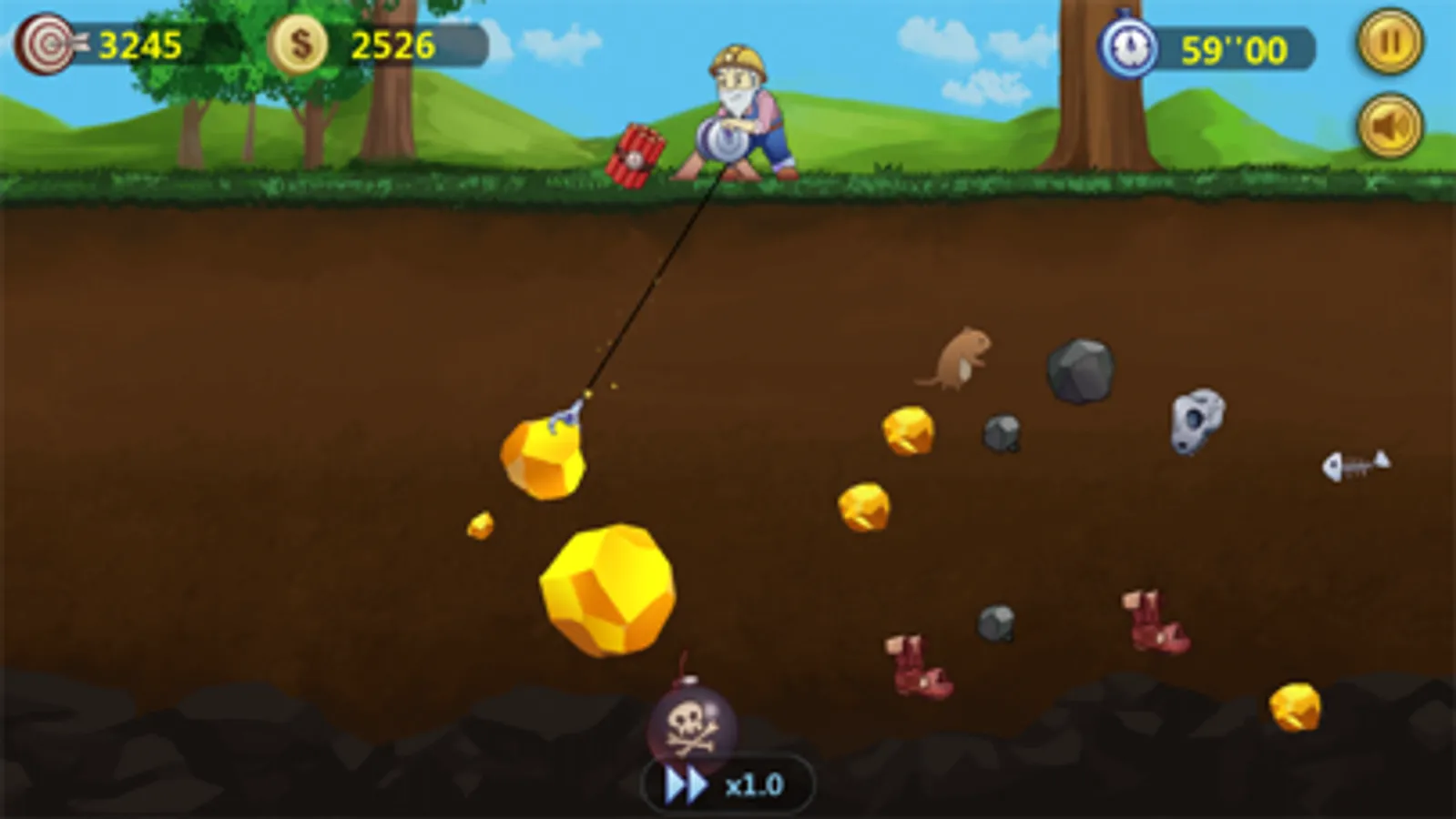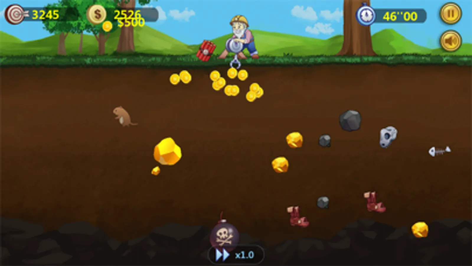 This is Gold Miner Classic version, Use your claw and reel to mine gold and other treasures out of the earth. Your claw will swing back and forth. Tap screen to lower it. Once it has grabbed something it will reel it up. Heavy objects like rocks and large pieces of gold will be harder to reel up. Grab bags contain random amounts of money, a strength power-up, or a stick of dynamite. Between levels you can buy items that can help you.