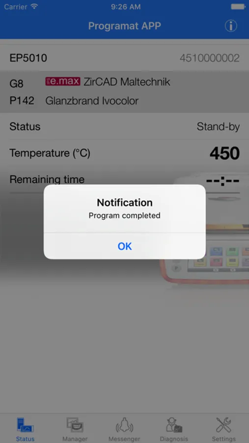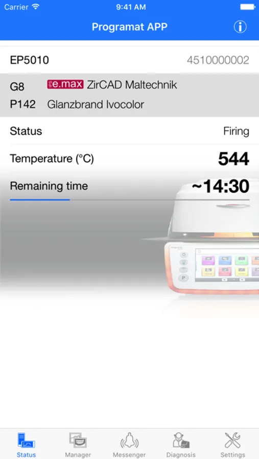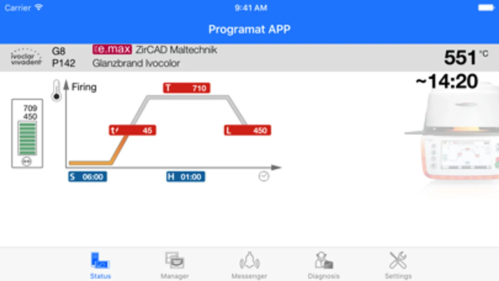 This app is designed for Programat press and ceramic furnaces. It displays the current program status and the firing curve of the program in operation on the screen of the smartphone. With the messenger function activated, a message will be shown as soon as the current firing or press program has been completed. Diagnostic data stored on the Programat device can be examined and shared via e-mail, if required. The DSA verification function automatically checks if all the criteria for the DSA analysis are met. The images can then be sent from the smartphone directly to the Programat furnace via WiFi at the touch of a button.