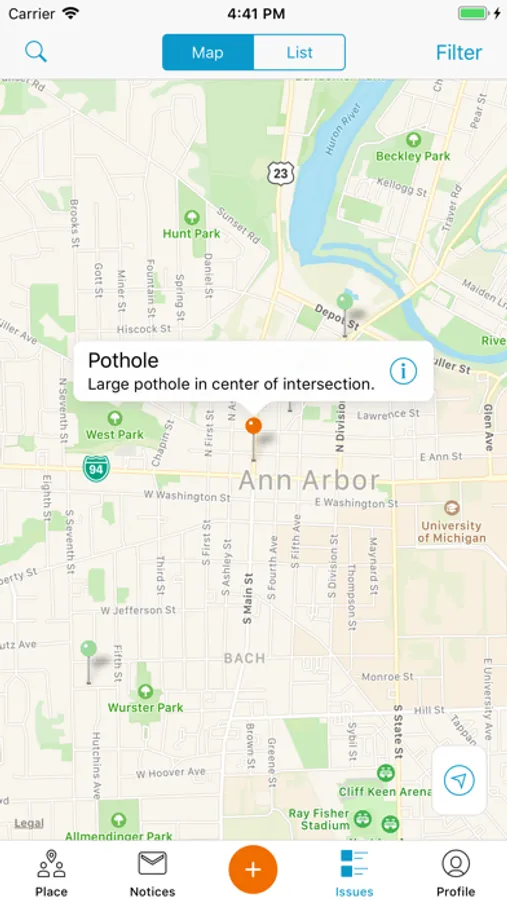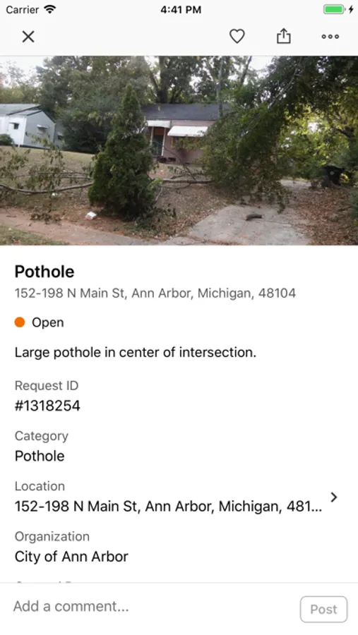See it, report it, get it fixed. From potholes to tree branches, the City of Ann Arbor’s new “A2 Fix It” system makes it simple and fast to notify City Hall of problems in our community. This app provides users the ability to track service requests, their own as well as others, and be notified when issues are resolved. The app’s GPS recognizes your location and has an easy to navigate menu of common issues. Users can report missed cart pickups, dark street lights, street tree problems, sidewalk hazards, clogged storm drains, graffiti, missing traffic signs, street flooding, park maintenance issues, and much more.