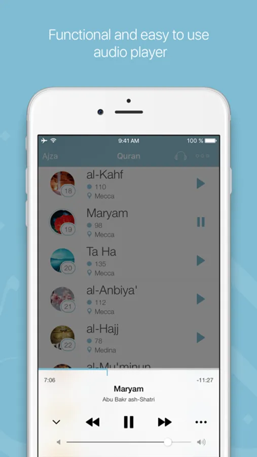 The application allows you to listen to Quran recitation with the voices of the best reciters in the world. Such as: Abdul Baset Abdus Samad; Abdul Rahman al-Sudais; Abdullah Awad al-Juhani; Abdullah Ibn Ali Basfar; Abu Bakr ash-Shatri; Ahmad bin Ali al-Ajmi; Emad al-Mansary; Hani ar-Rifai; Maher al-Muaiqly; Mahmood al-Rifai; Mahmoud Khalil al-Hussary; Mishari Rashid al-Afasy; Muhammad al-Luhaidan; Muhammad al-Minshawi; Nasser al-Qatami; Saad al-Ghamdi; Salah Abdul Rahman Bukhatir; Salah al-Budair; Salah al-Hashim; Saud al-Shuraim; Tawfeeq al-Sayegh; Yasser al-Dosari.