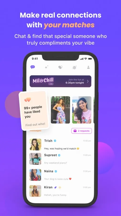 When using Dil Mil, swipe right on someone you like. If they like you back, you will match! You can then start chatting for free. To match with more South Asian singles faster, you have the option to use in-app upgrades and subscribe to VIP Elite, giving you access to premium features such as instant matches, boosts, and more.