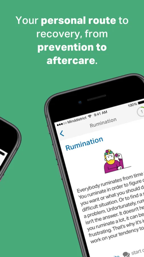 Minddistrict helps you to master your own wellbeing. When you want to change your lifestyle, for instance, or if you want to worry less or want to quit smoking. But also if you have mental health issues or have to learn to live with a (chronic) illness. Minddistrict helps you to change the way you think and behave, in an accessible way that suits your needs.