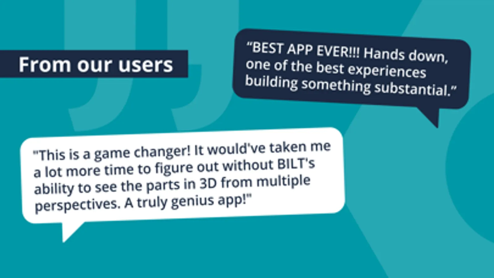 - “I really like putting things together, but the BILT app made it a breeze! A fun little activity and a great outcome. I’m a visual learner so I really appreciate a 3D option with parts clearly labeled!! I could build a million things with the help of this app particularly. Highly recommend!!!”