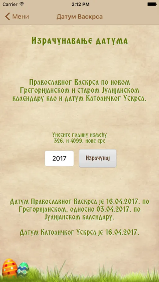 - Izračunavanje datuma Vaskrsa, kao i katoličkog Uskrsa, jednostavnim unosom godine.