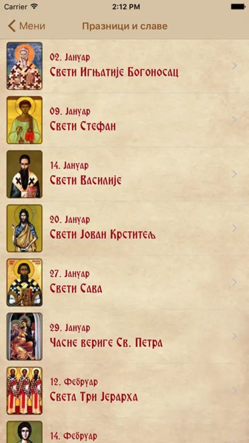 - Holidays and Patron saints day dates. Every Holiday and Patron saints day, besides the date, also contain the saint icon as well as his biography.